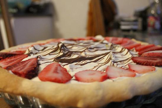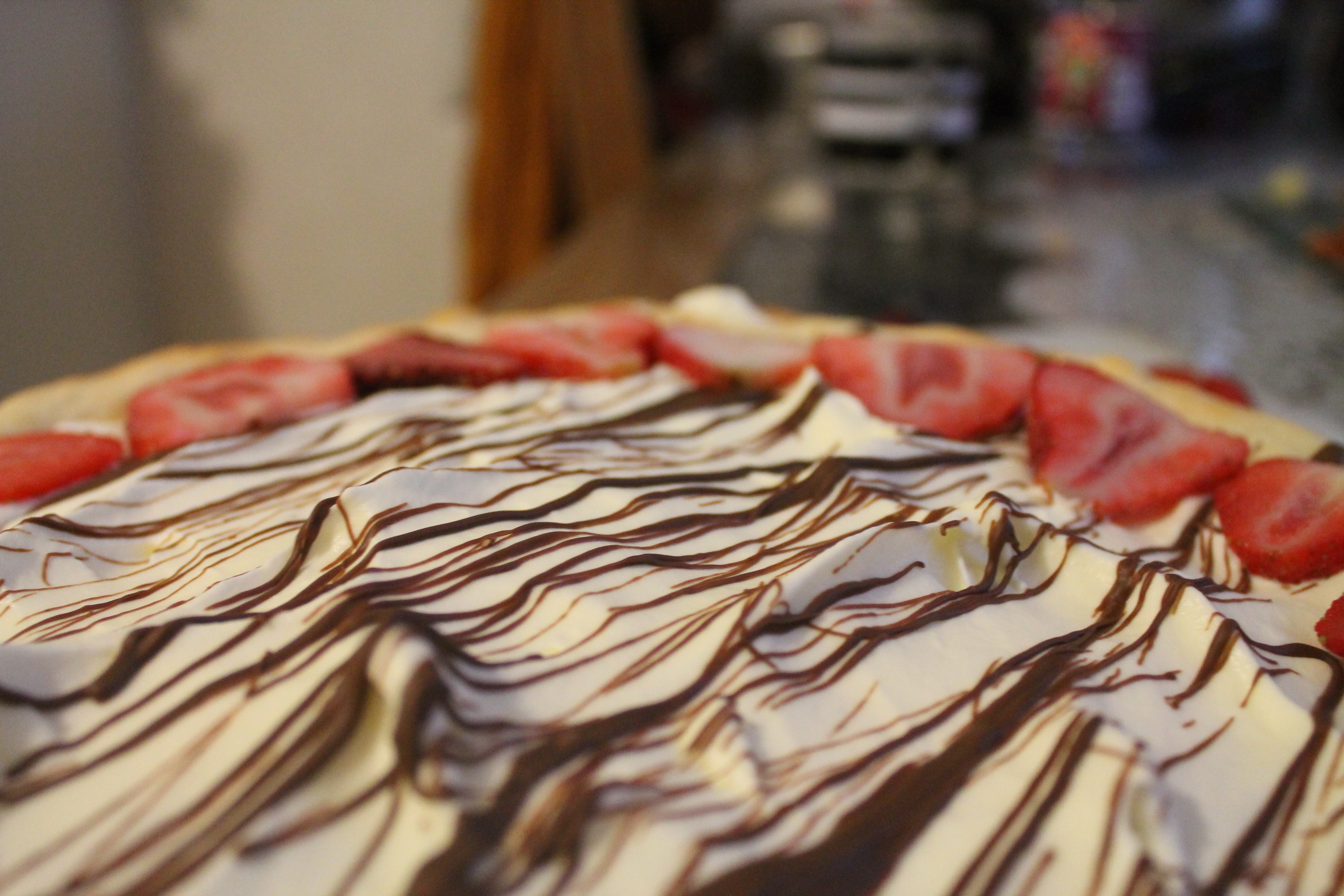 Lägg choklad i vattenbad och tillsätt en nypa socker. Sedan använder du en kniv till att göra chokladdekorationer och även ringla över choklad på fyllningen. Skriva jordgubbar och dekorera hur du vill, går bra med någon annan frukt/bär!