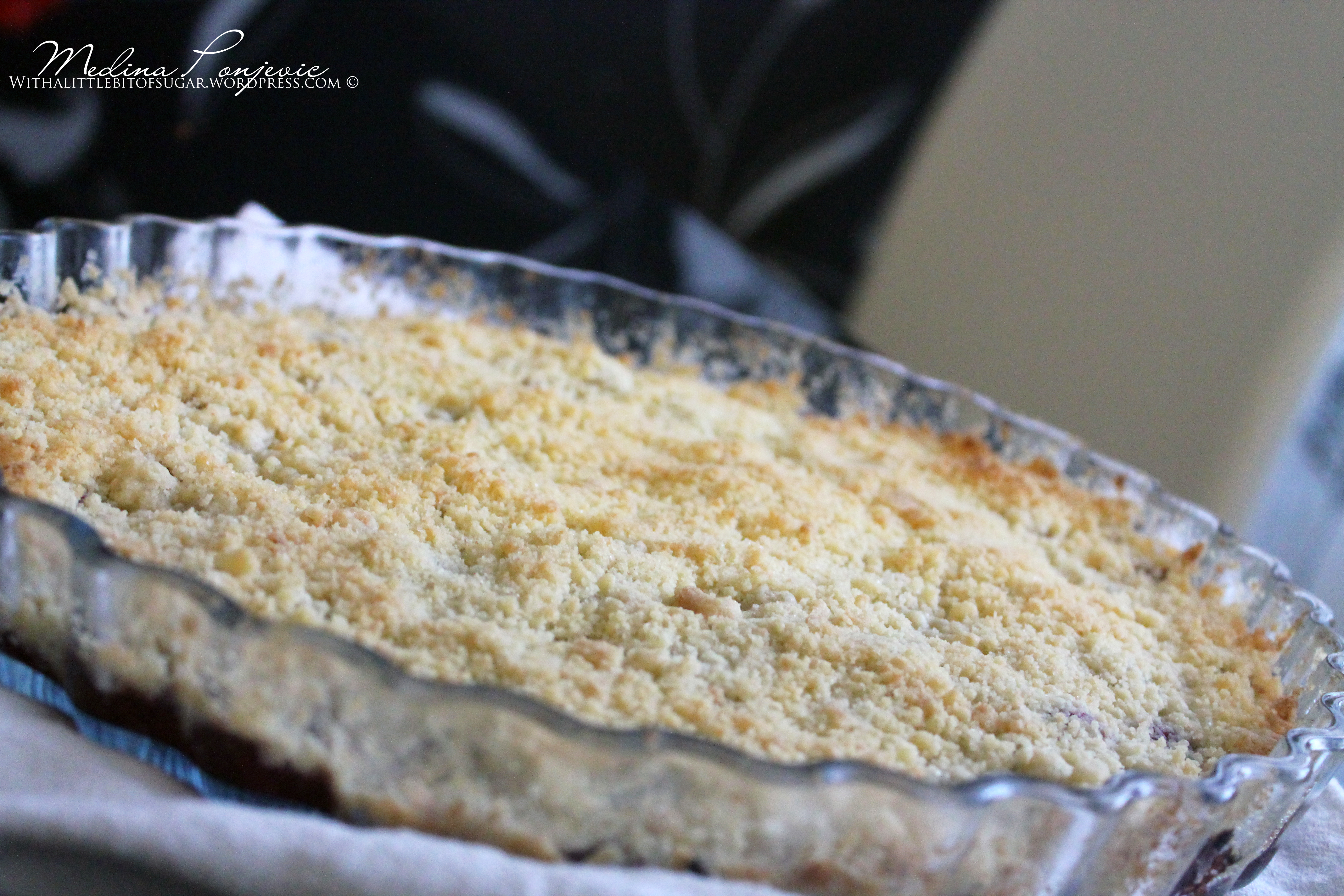 Den här pajen är riktigt god om man gillar smulpaj. Påminner mig så mycket om sommaren, uh vad jag saknar sommaren! Och den blommande våren! När man har slut på vaniljsocker till vaniljsåsen så måste man improvisera fort, som tur var så hade jag lite vit choklad som man hackade grovt och rörde ner i såsen. Så detta blev en lite annorlunda vaniljsås, men riktigt god var den 🙂 Riktig god sommarpaj. hehe det ser ut som kokos på bilden men jag råkade köra lite för länge i min kitchen aid, så det blev inga fina klumpar 😦